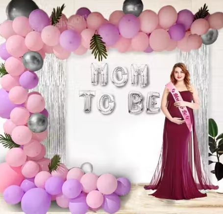 Mom to Be Baby Shower Balloon Decoration Kit – 66 Pcs Combo – Silver Foil Balloon, Latex, Pastel Balloon with Silver Curtain, Sash and Balloon Pump